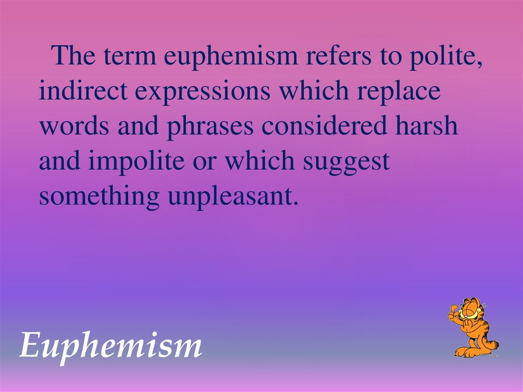 The term euphemism refers to polite,indirect expressions which replace