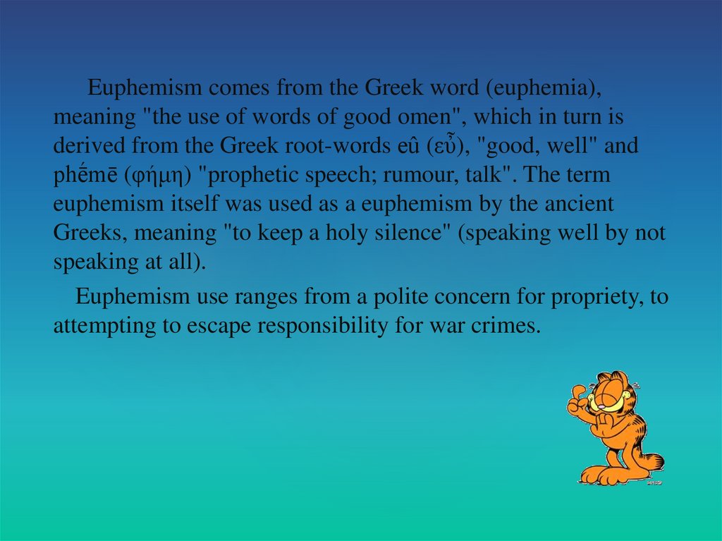 Euphemism comes from the Greek word (euphemia),meaning "the use of words of good omen", which in turn is