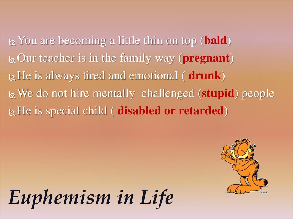 You are becoming a little thin on top (bald)Our teacher is in the family way (pregnant)