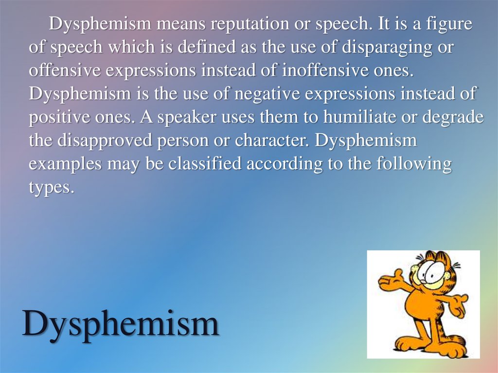 Dysphemism means reputation or speech. It is a figureof speech which is defined as the use of disparaging or