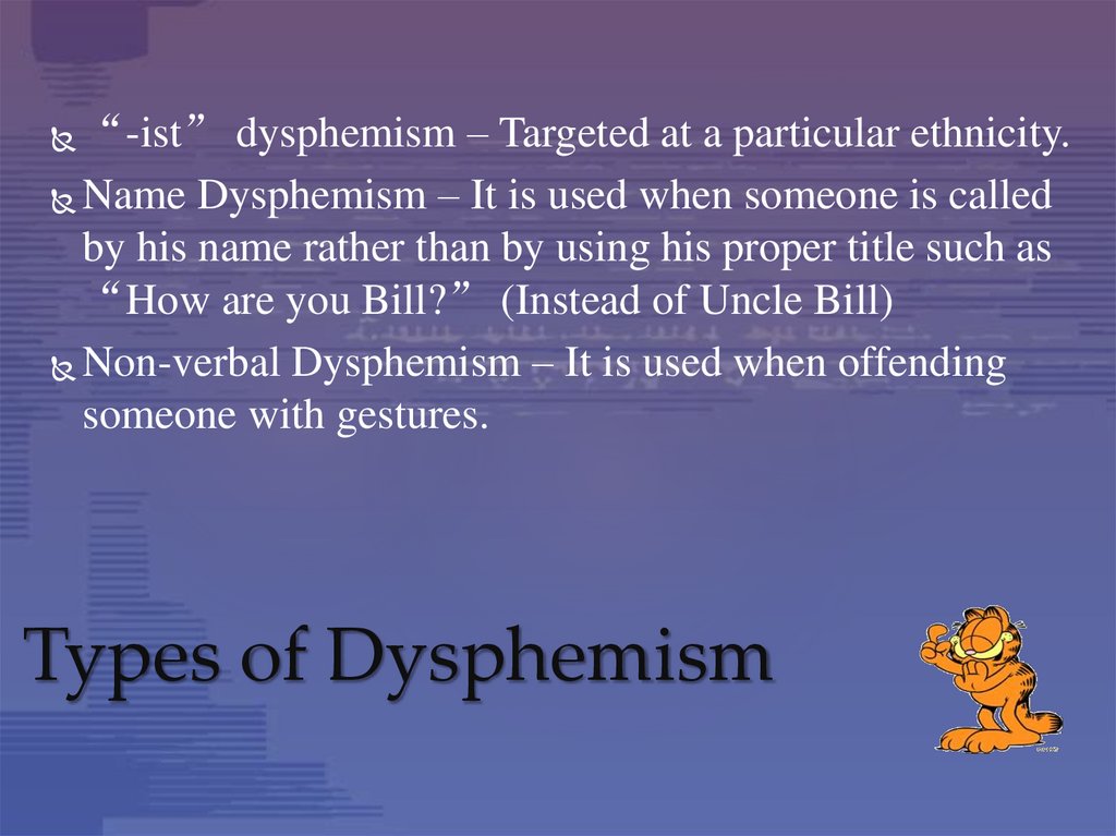 “-ist” dysphemism – Targeted at a particular ethnicity.Name Dysphemism – It is used when someone is called