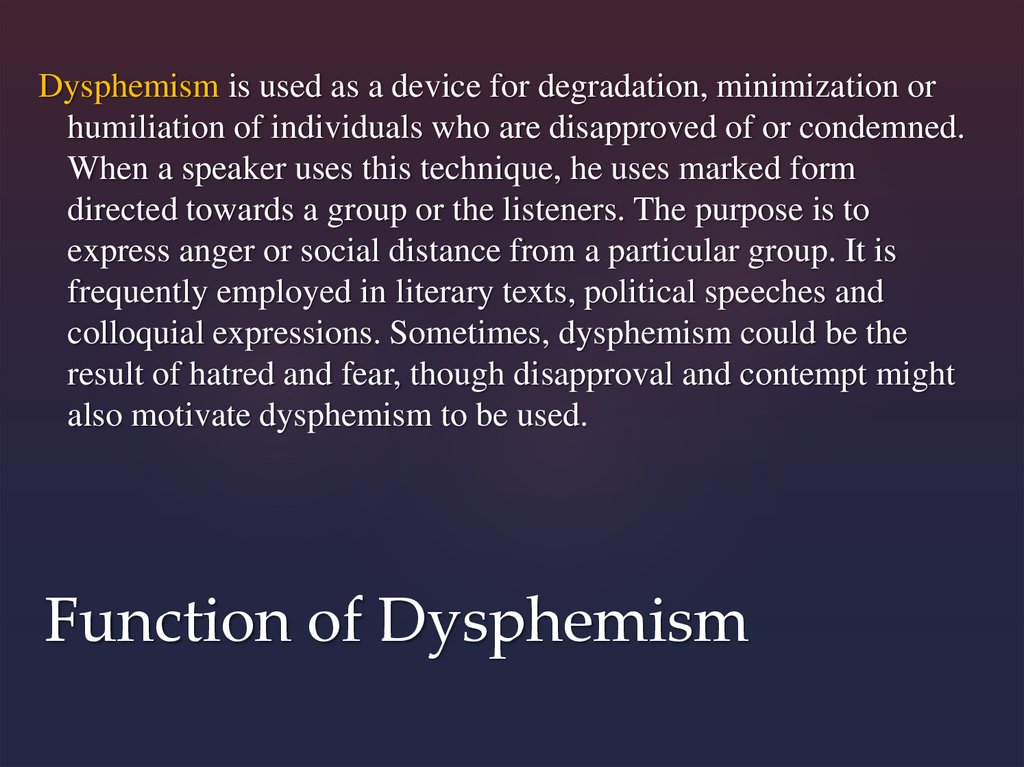 Dysphemism is used as a device for degradation, minimization orhumiliation of individuals who are disapproved of or condemned.