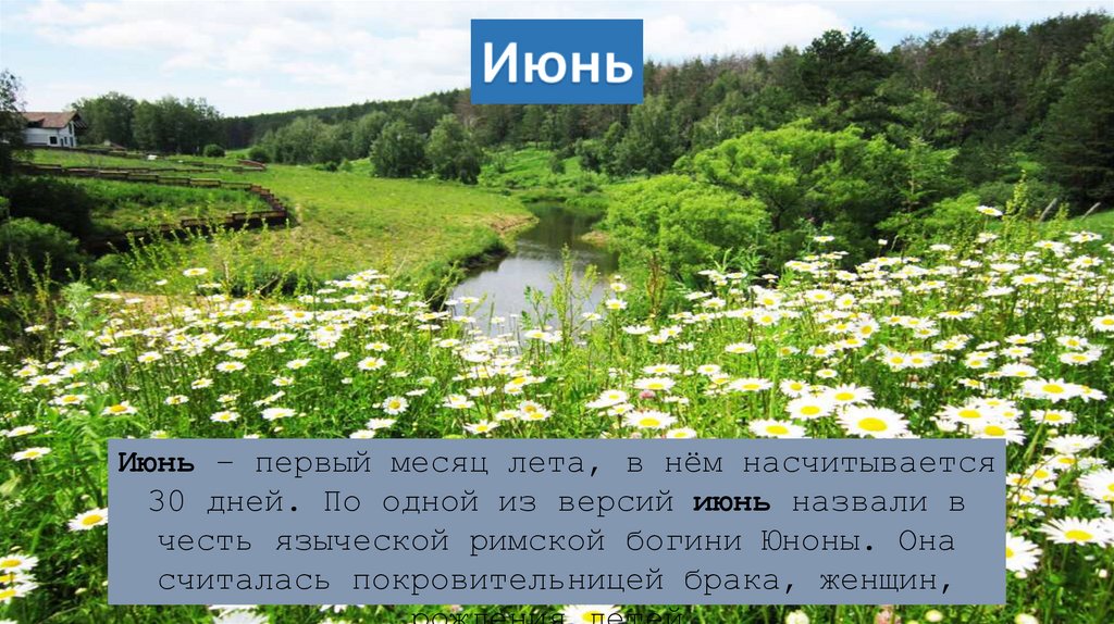 Июнь – первый месяц лета, в нём насчитывается30 дней. По одной из версий июнь назвали в