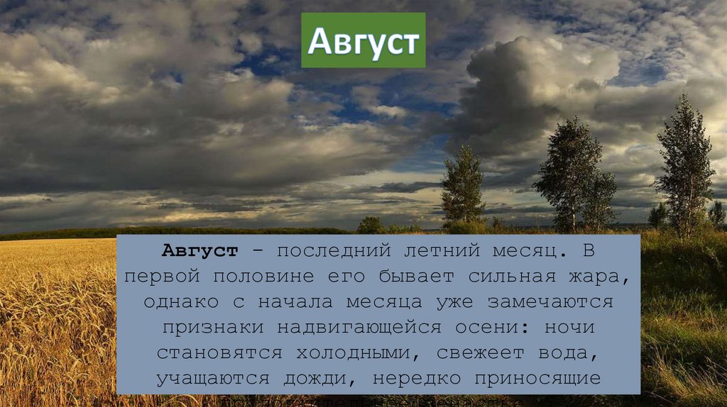 Август - последний летний месяц. Впервой половине его бывает сильная жара,