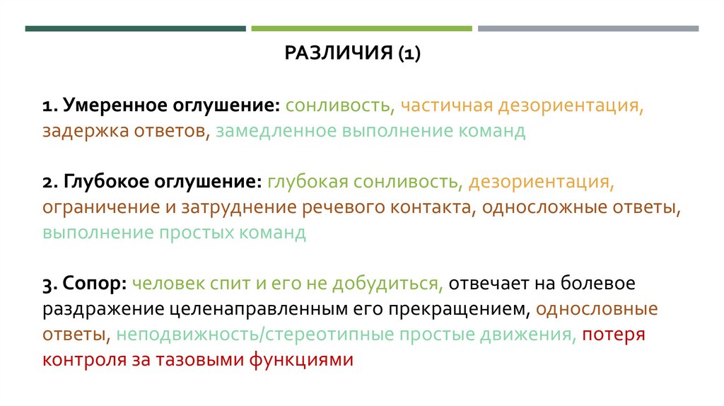 РАЗЛИЧИЯ (1)1. Умеренное оглушение: сонливость, частичная дезориентация,