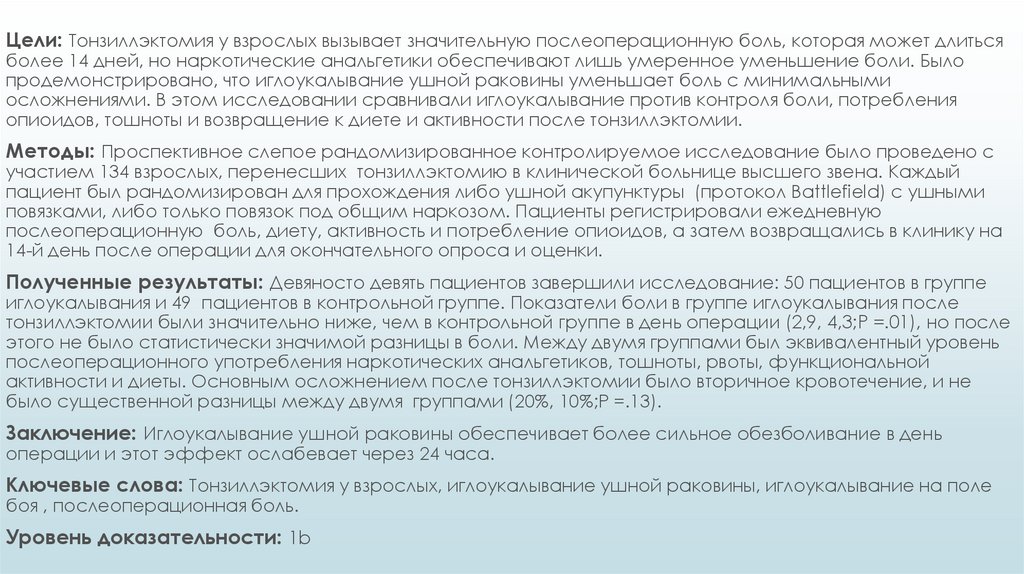 Цели: Тонзиллэктомия у взрослых вызывает значительную послеоперационную боль, которая может длитьсяболее 14 дней, но наркотические анальгетики обеспечивают лишь умеренное уменьшение боли. Было