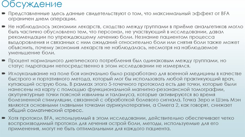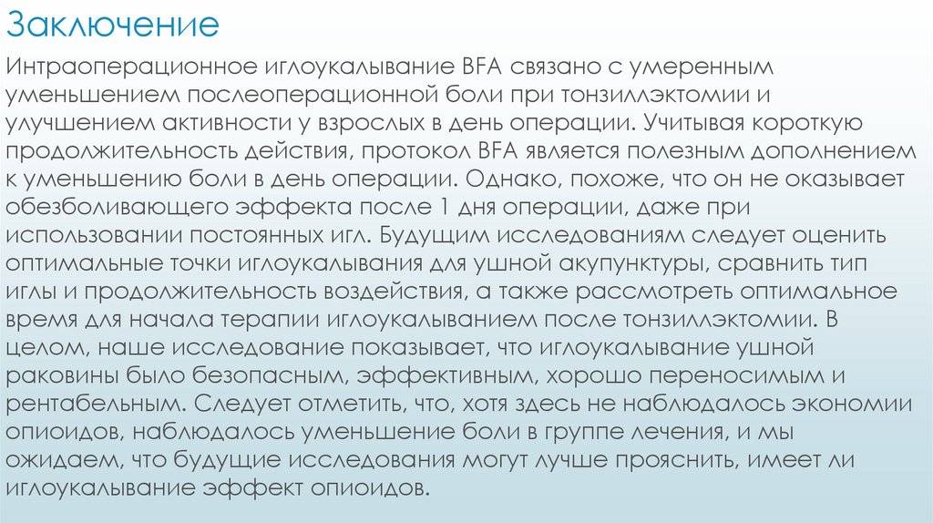 Заключение: Иглоукалывание ушной раковины обеспечивает более сильное обезболивание в день