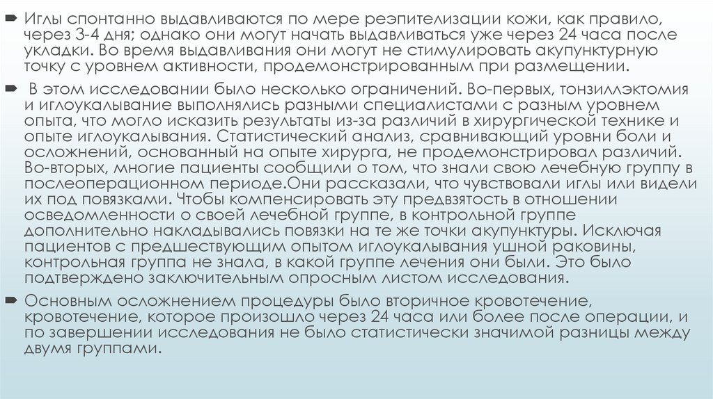 осложнениями. В этом исследовании сравнивали иглоукалывание против контроля боли, потребления
