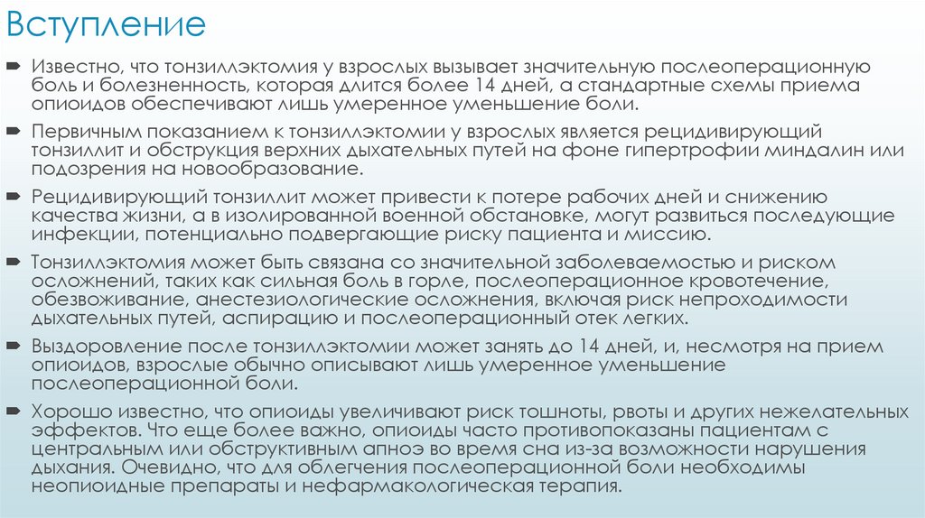 ВступлениеИзвестно, что тонзиллэктомия у взрослых вызывает значительную послеоперационную