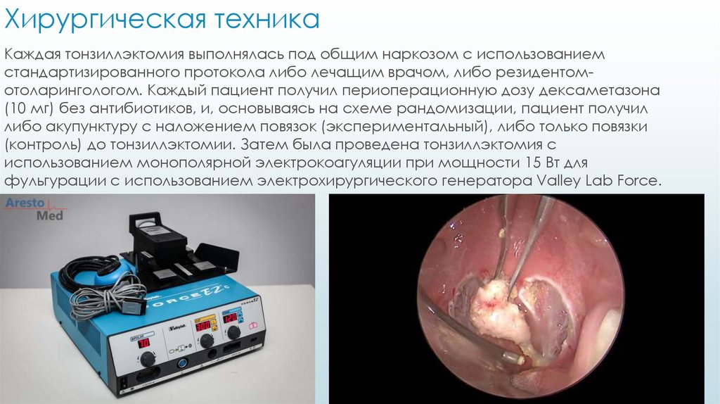 Хирургическая техникаКаждая тонзиллэктомия выполнялась под общим наркозом с использованием