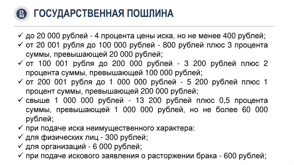ГОСУДАРСТВЕННАЯ ПОШЛИНАдо 20 000 рублей - 4 процента цены иска, но не менее 400 рублей;
