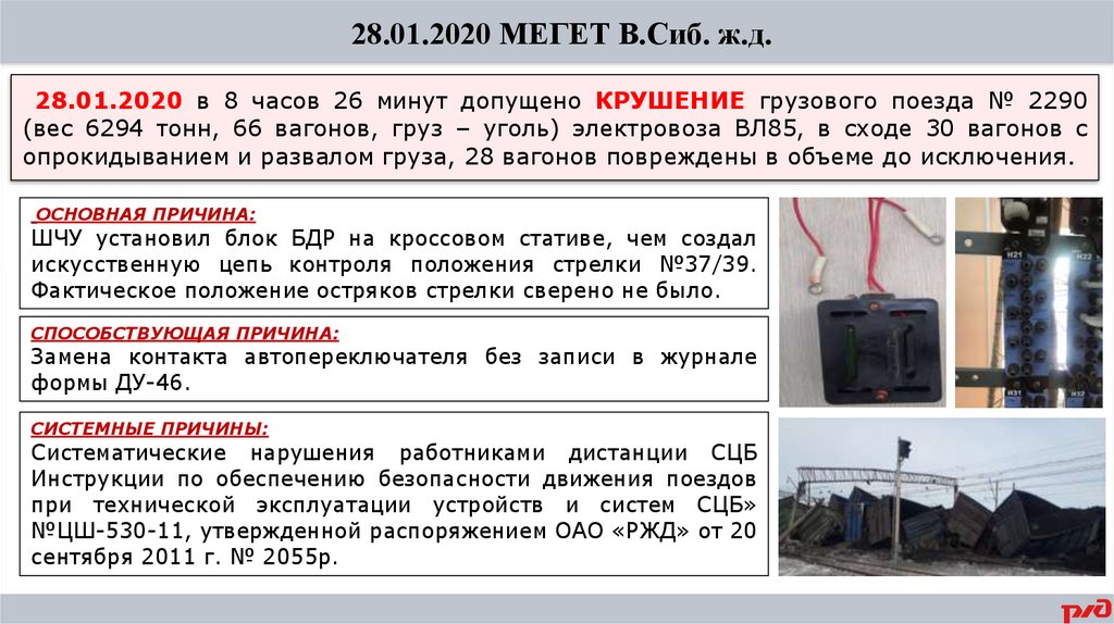 28.01.2020 МЕГЕТ В.Сиб. ж.д.28.01.2020 в 8 часов 26 минут допущено КРУШЕНИЕ грузового поезда № 2290