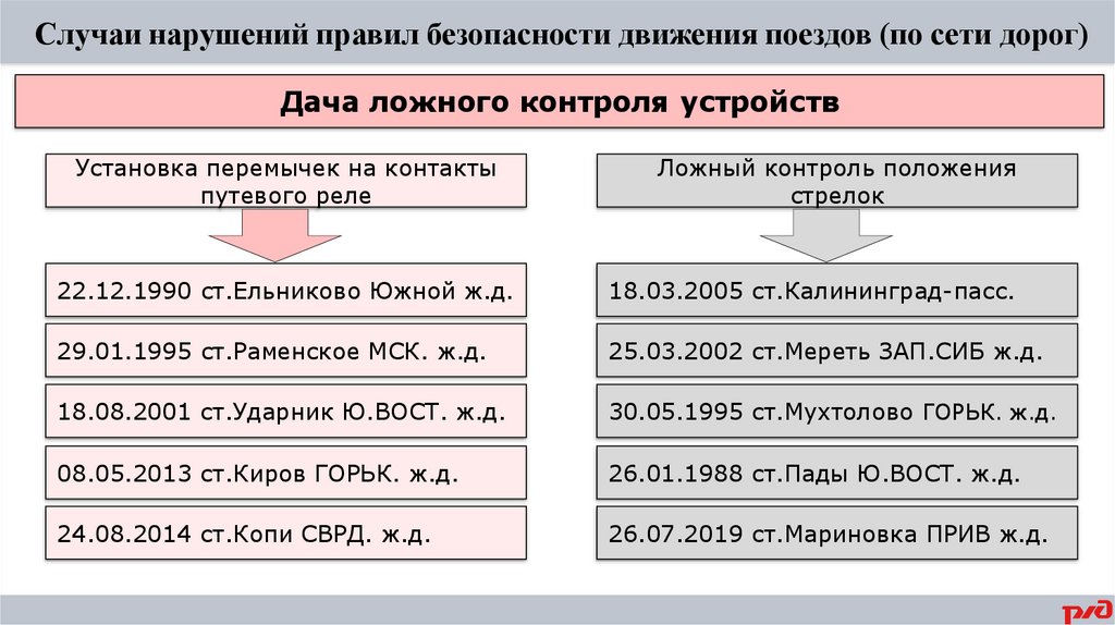 Случаи нарушений правил безопасности движения поездов (по сети дорог)Дача ложного контроля устройств
