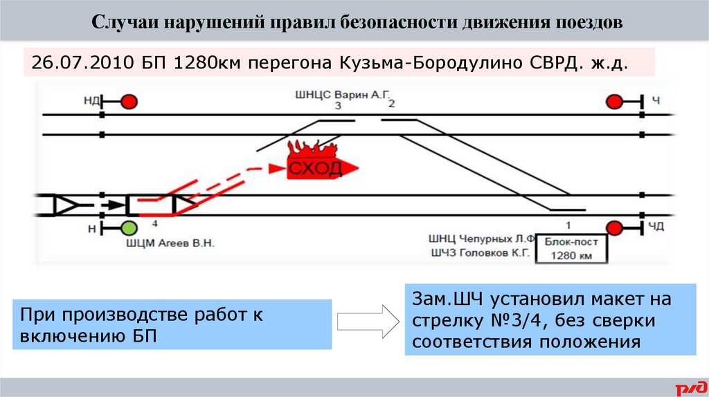 Случаи нарушений правил безопасности движения поездов26.07.2010 БП 1280км перегона Кузьма-Бородулино СВРД. ж.д.