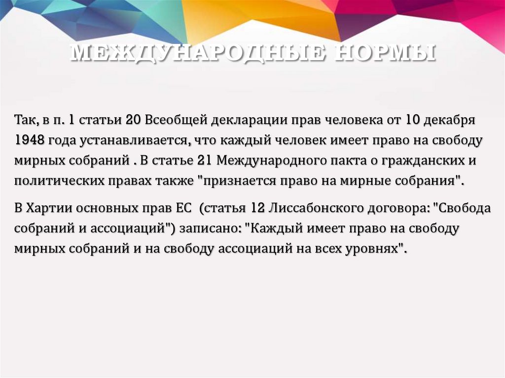МЕЖДУНАРОДНЫЕ НОРМЫТак, в п. 1 статьи 20 Всеобщей декларации прав человека от 10 декабря