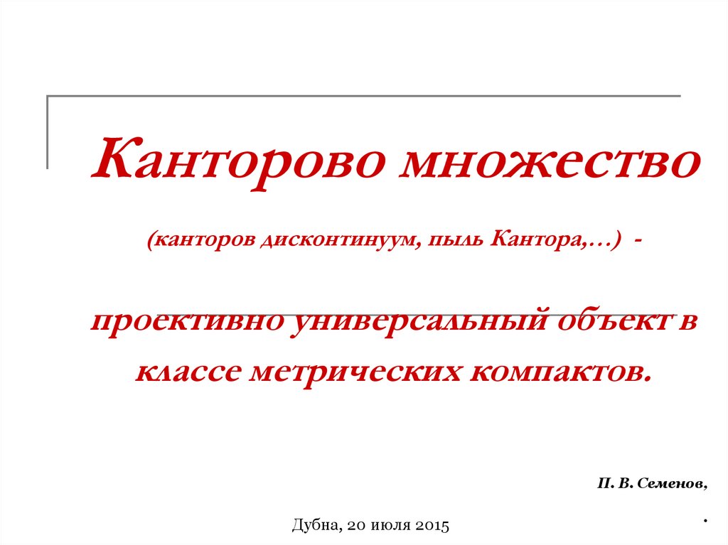 1. Канторово множество (канторов дисконтинуум, пыль Кантора,…) - проективно универсальный объект в классе метрических компактов.
