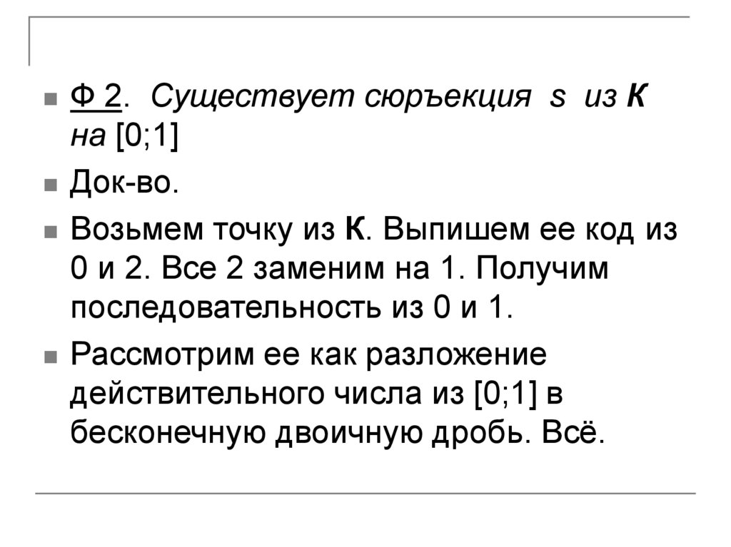 Ф 1.К континуально(=существует биекция между Ки [0;1] ).