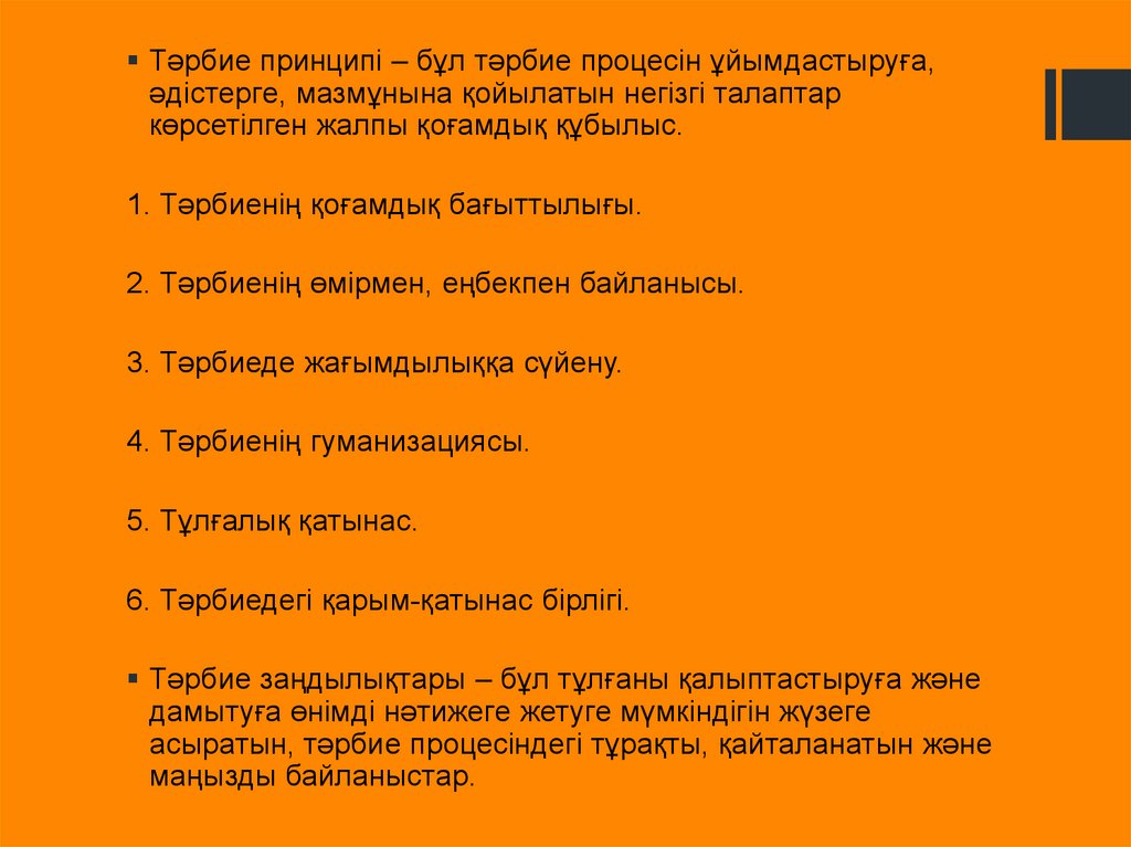 Тәрбие принципі – бұл тәрбие процесін ұйымдастыруға,әдістерге, мазмұнына қойылатын негізгі талаптар