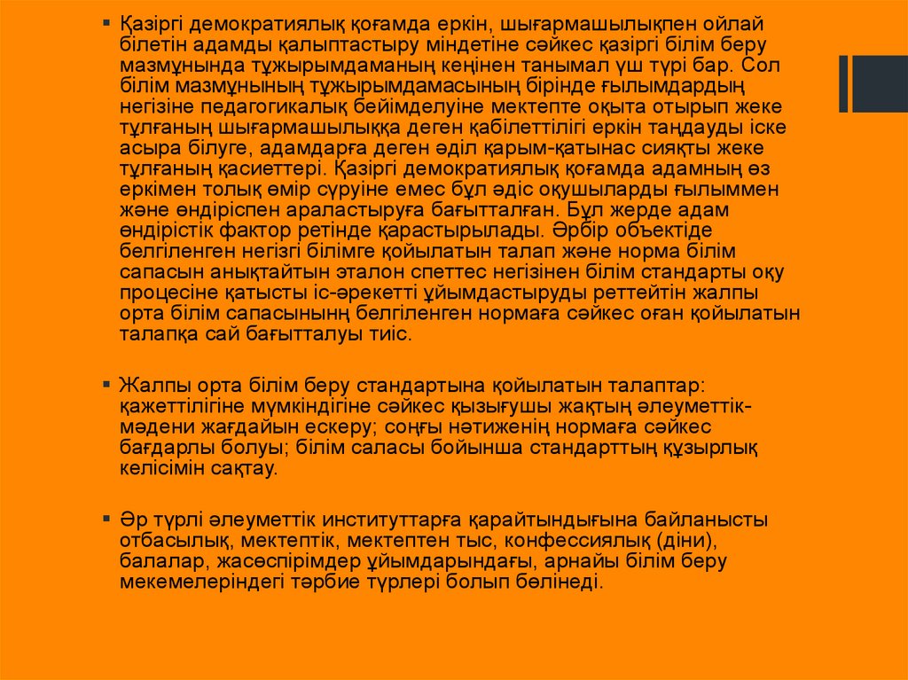 Қазіргі демократиялық қоғамда еркін, шығармашылықпен ойлайбілетін адамды қалыптастыру міндетіне сәйкес қазіргі білім беру