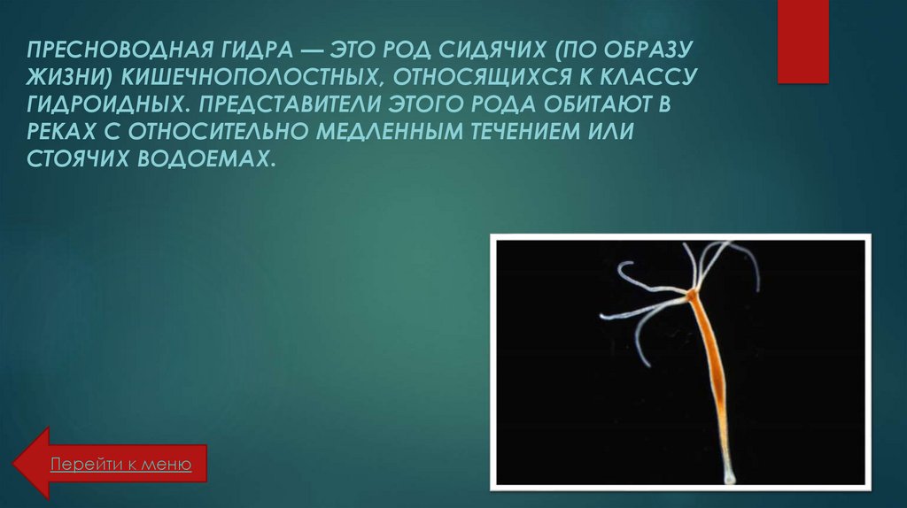 ПРЕСНОВОДНАЯ ГИДРА — ЭТО РОД СИДЯЧИХ (ПО ОБРАЗУЖИЗНИ) КИШЕЧНОПОЛОСТНЫХ, ОТНОСЯЩИХСЯ К КЛАССУ