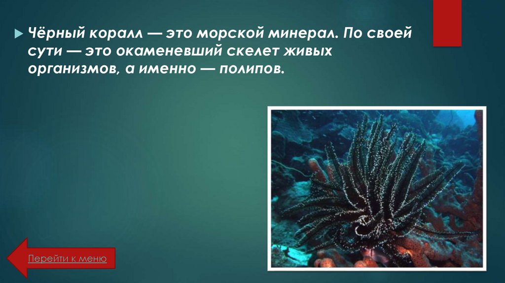 Чёрный коралл — это морской минерал. По своейсути — это окаменевший скелет живых