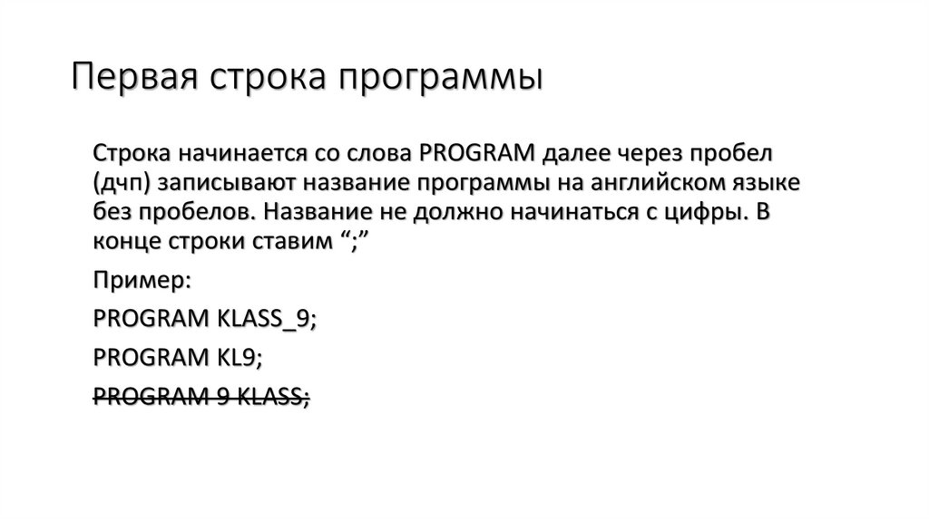 Первая строка программыСтрока начинается со слова PROGRAM далее через пробел