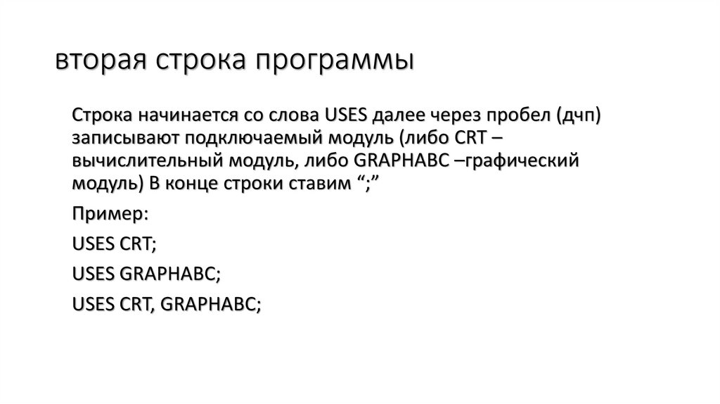 вторая строка программыСтрока начинается со слова USES далее через пробел (дчп)