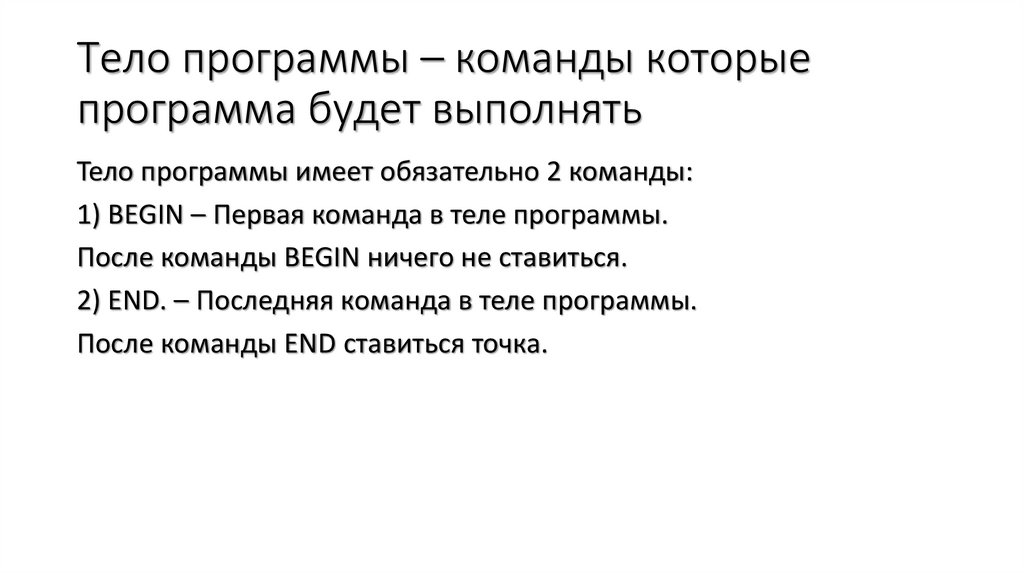 Тело программы – команды которыепрограмма будет выполнять