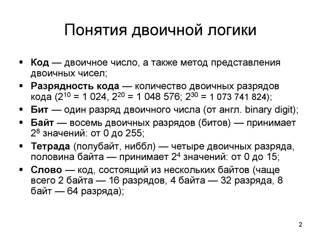 Понятия двоичной логикиКод — двоичное число, а также метод представления