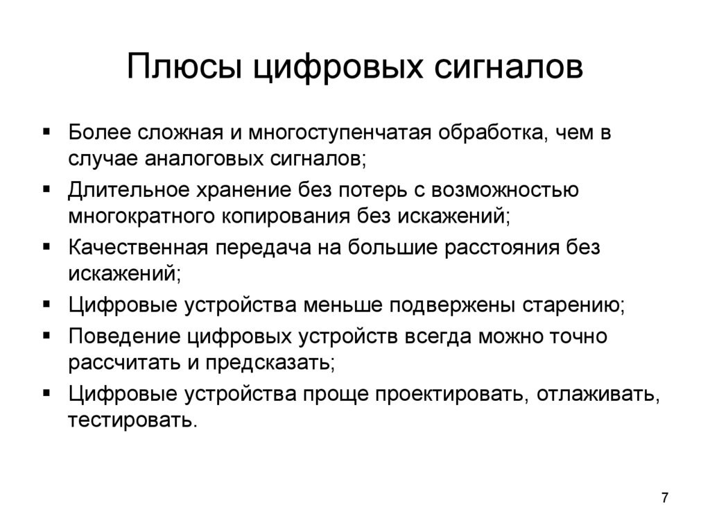 Плюсы цифровых сигналовБолее сложная и многоступенчатая обработка, чем в