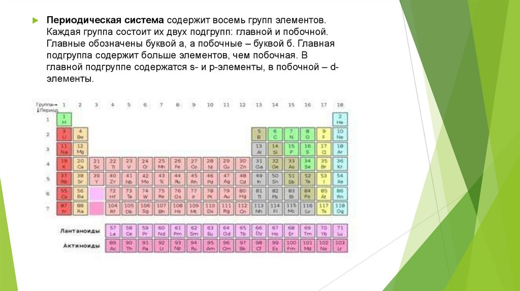 Периодическая система содержит восемь групп элементов.Каждая группа состоит их двух подгрупп: главной и побочной.