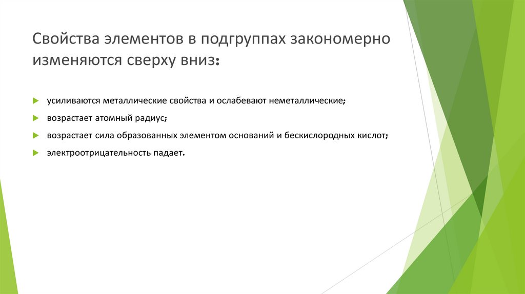 Свойства элементов в подгруппах закономерноизменяются сверху вниз: