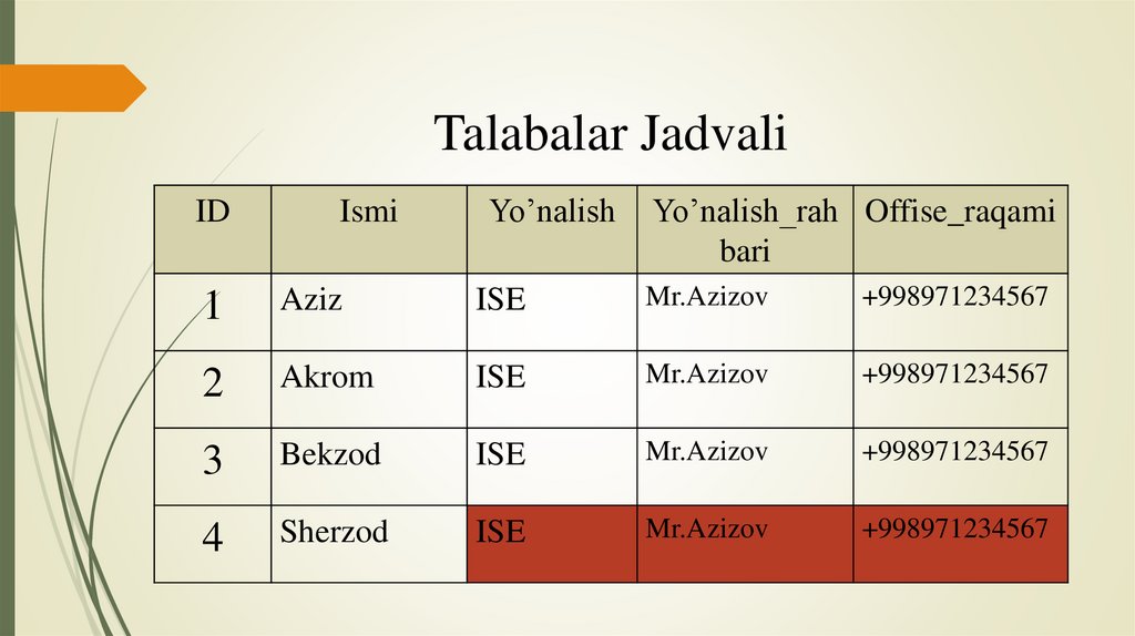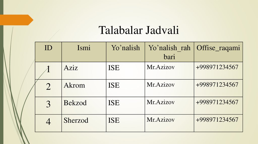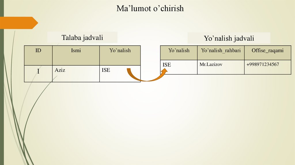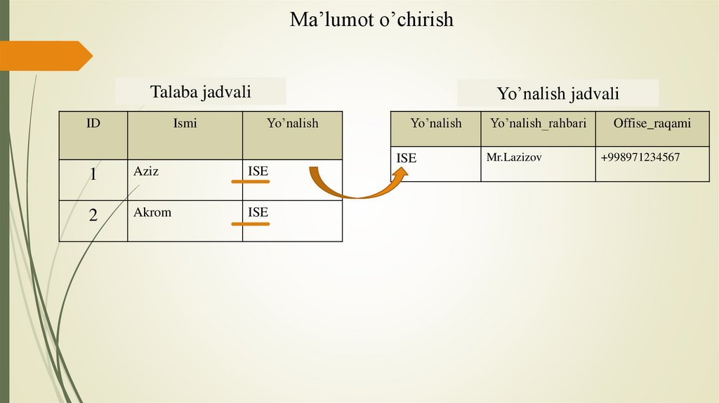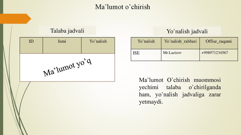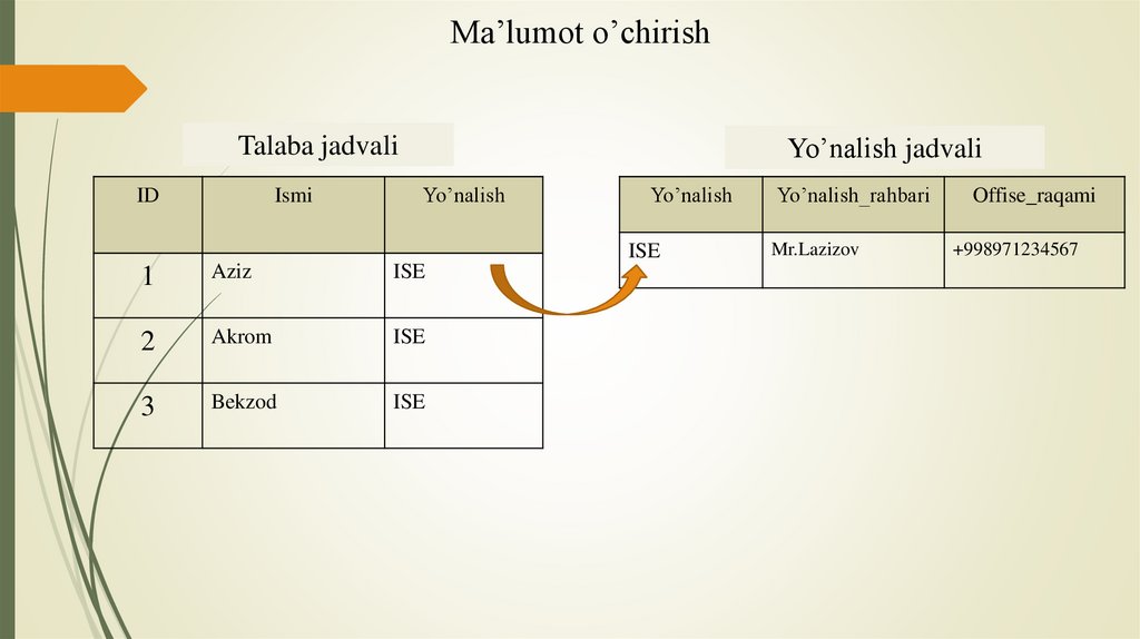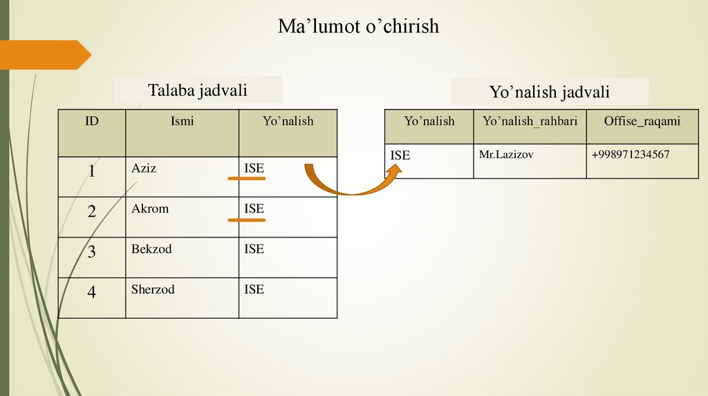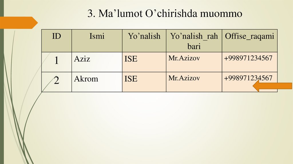 • Ma’lumotlar bazasidagi ma’lumotni chaqirib olish