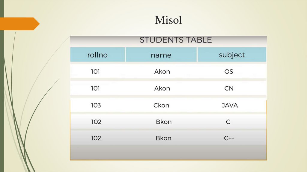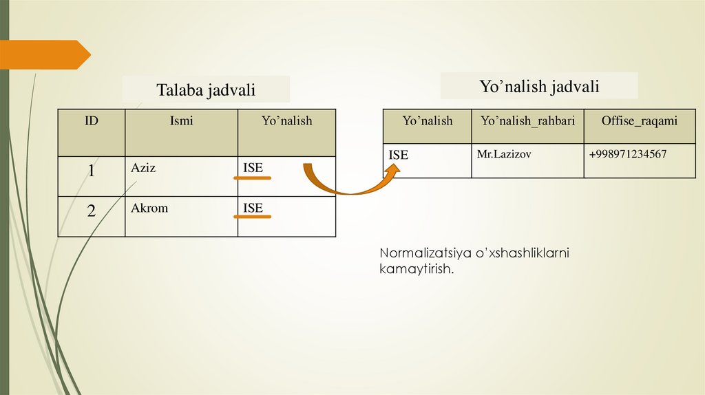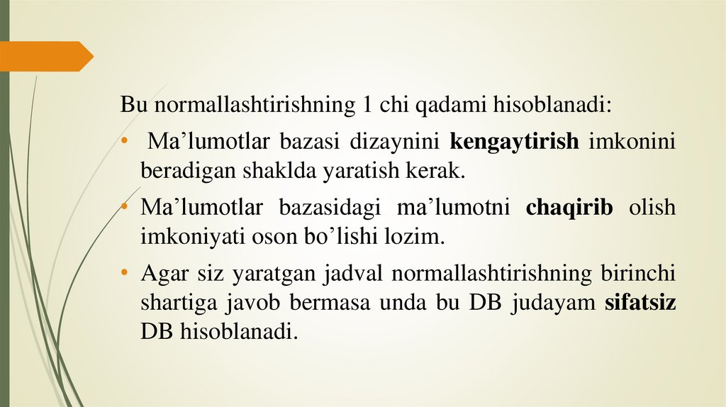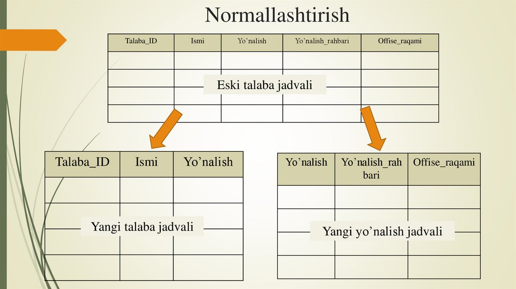 Bu normallashtirishning 1 chi qadami hisoblanadi:• Ma’lumotlar bazasi dizaynini kengaytirish imkonini