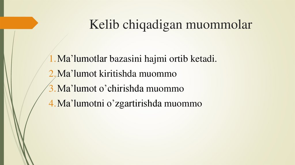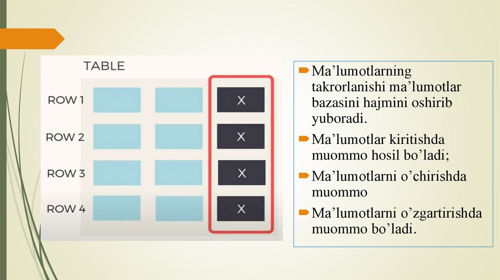 Kelib chiqadigan muommolar1.Ma’lumotlar bazasini hajmi ortib ketadi.