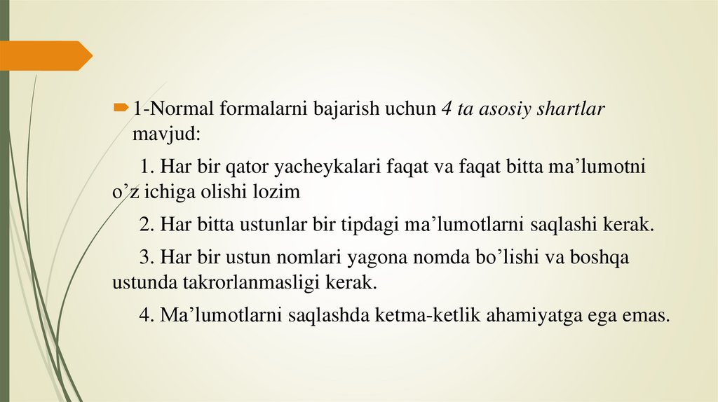 1-Normal formalarni bajarish uchun 4 ta asosiy shartlarmavjud:
