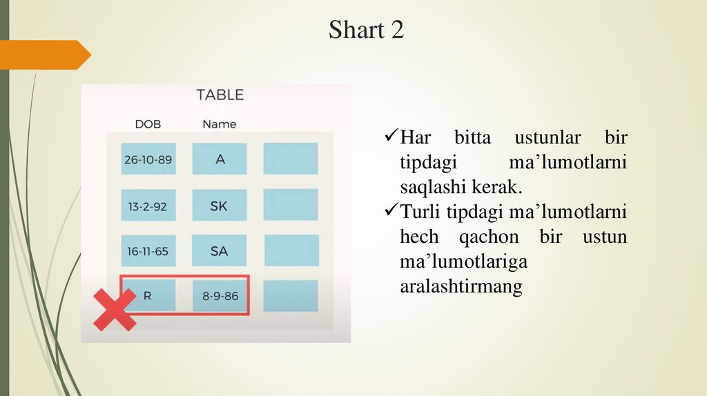 2. Har bitta ustunlar bir tipdagi ma’lumotlarni saqlashi kerak.