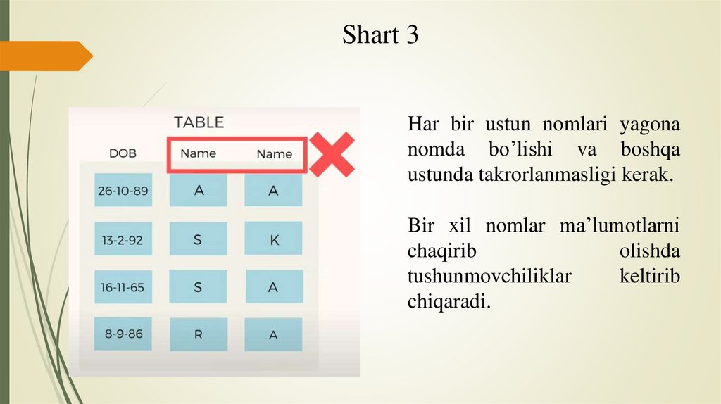 3. Har bir ustun nomlari yagona nomda bo’lishi va boshqa
