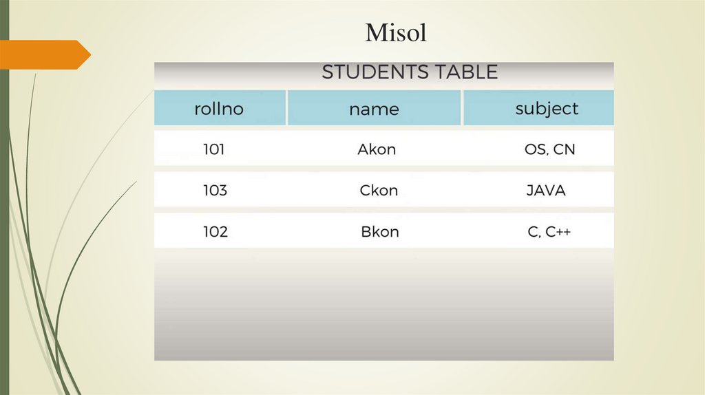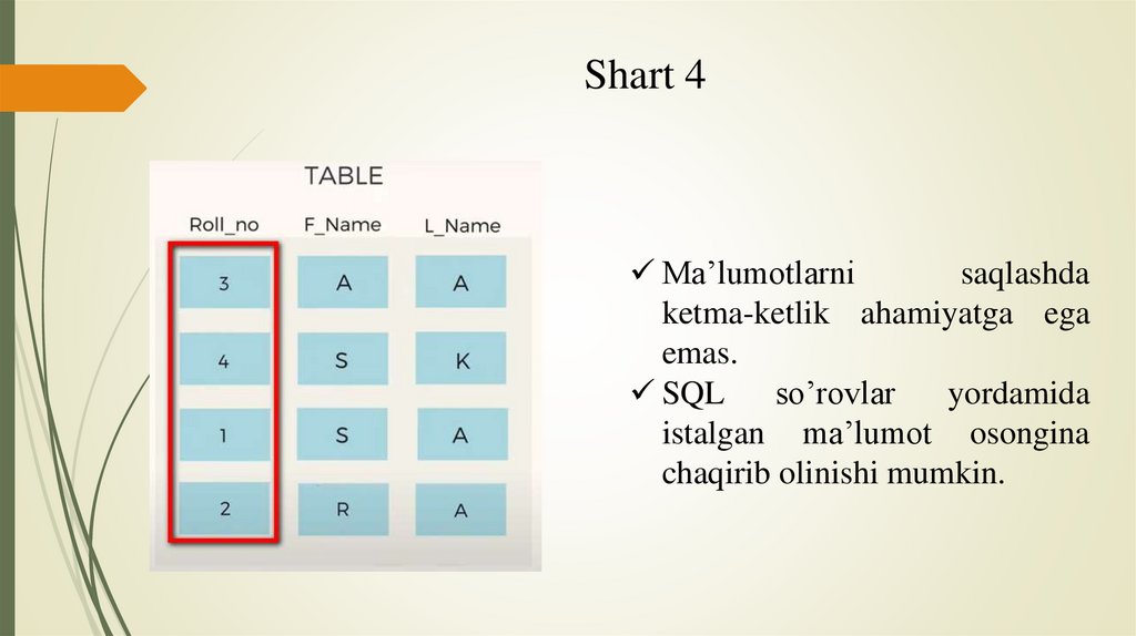 4. Ma’lumotlarni saqlashda ketma-ketlik ahamiyatga ega emas.