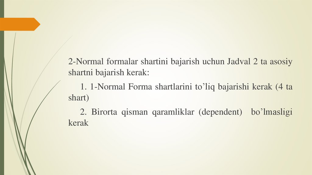 2-Normal formalar shartini bajarish uchun Jadval 2 ta asosiyshartni bajarish kerak: