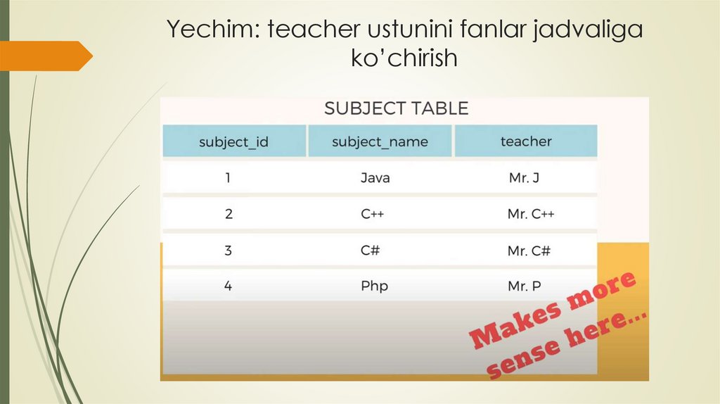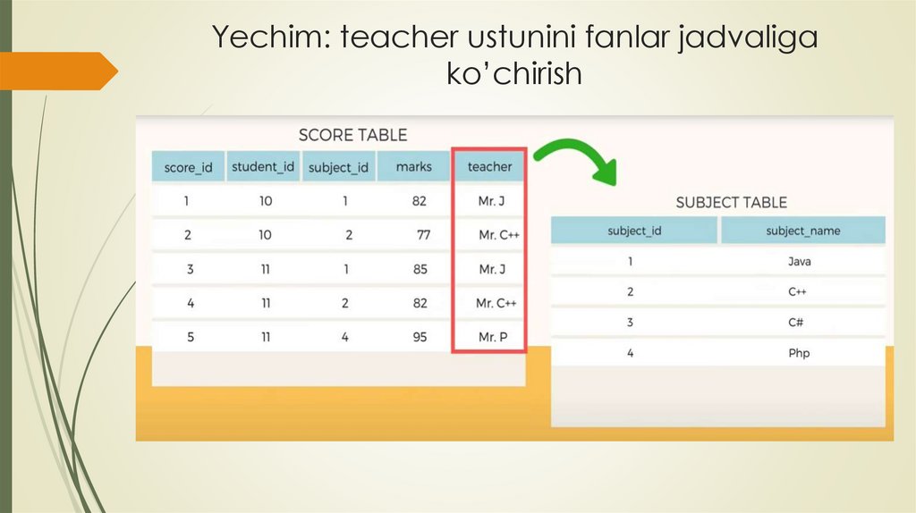 Yechim: teacher ustunini fanlar jadvaligako’chirish