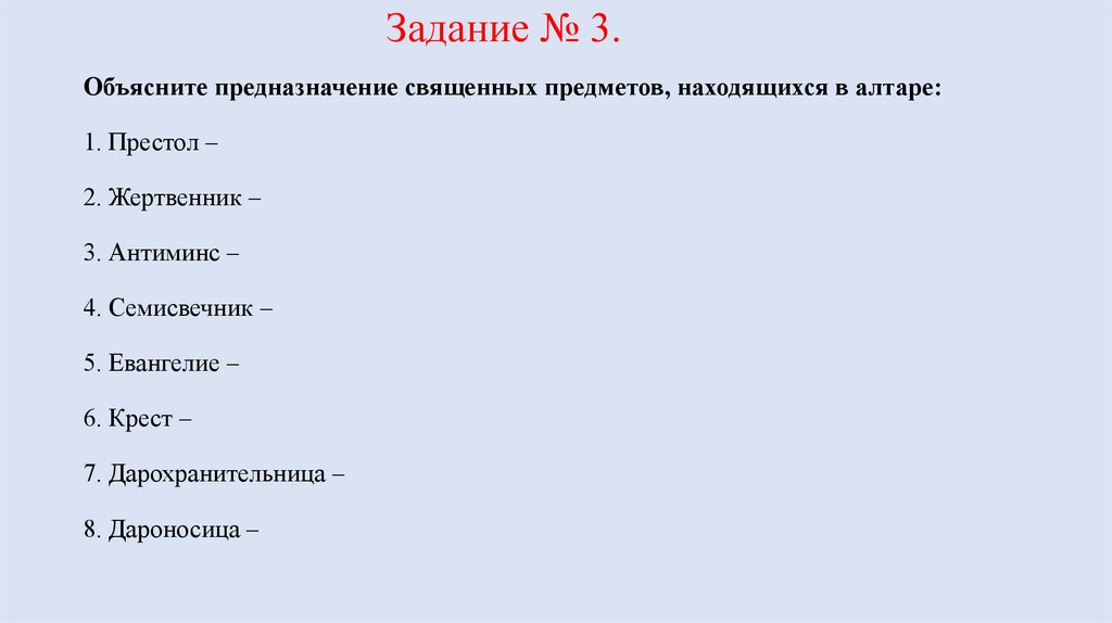 Задание № 3.Объясните предназначение священных предметов, находящихся в алтаре: