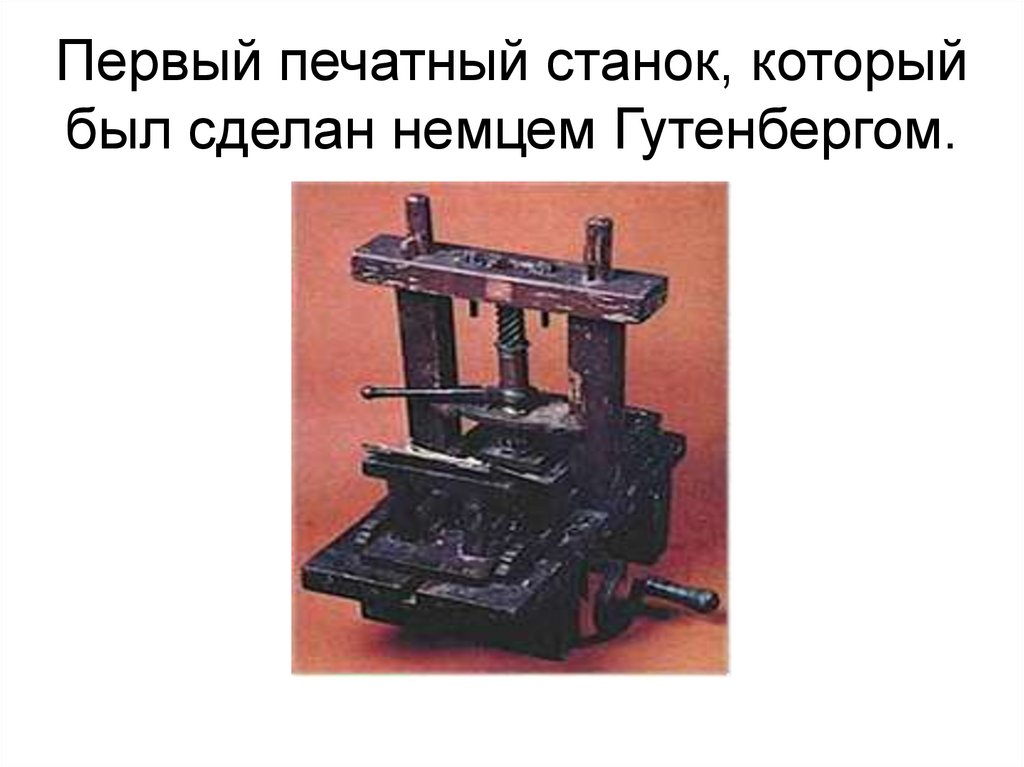 Первый печатный станок, которыйбыл сделан немцем Гутенбергом.