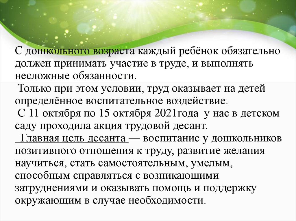 С дошкольного возраста каждый ребёнок обязательнодолжен принимать участие в труде, и выполнять