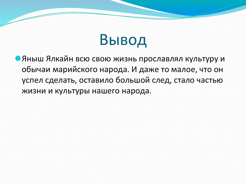 Вывод⚫Яныш Ялкайн всю свою жизнь прославлял культуру и