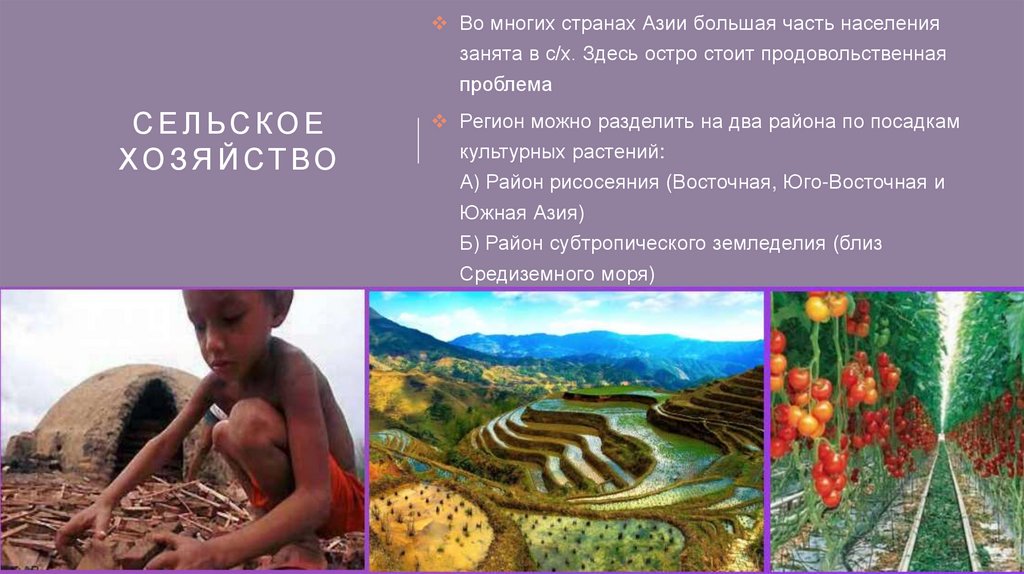 Во многих странах Азии большая часть населениязанята в с/х. Здесь остро стоит продовольственная
