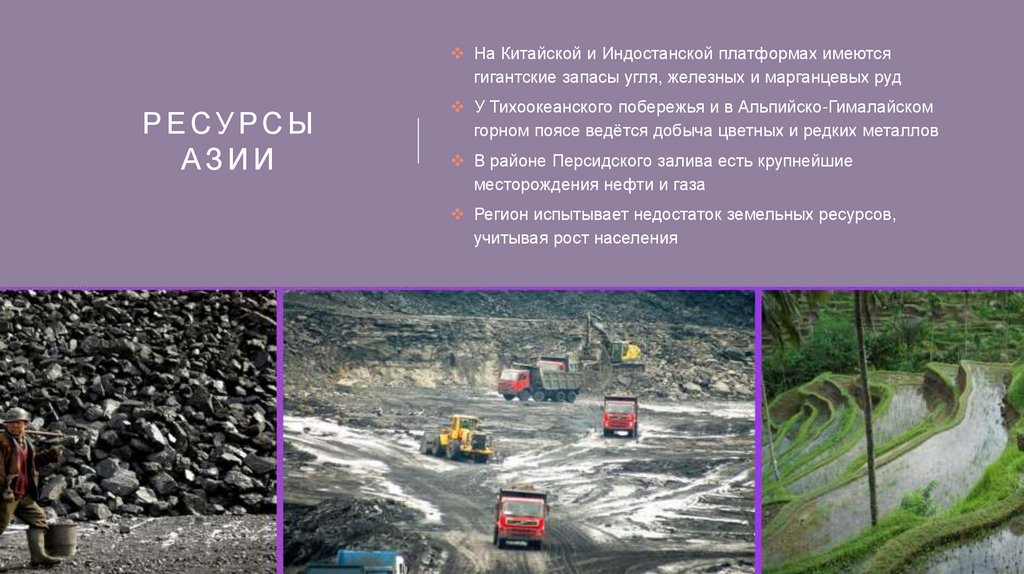 На Китайской и Индостанской платформах имеютсягигантские запасы угля, железных и марганцевых руд