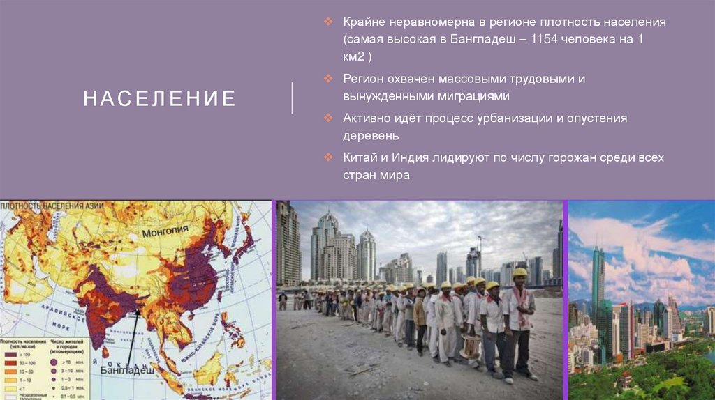 Крайне неравномерна в регионе плотность населения(самая высокая в Бангладеш – 1154 человека на 1