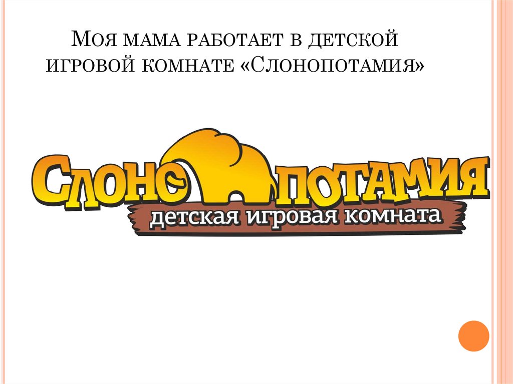 МОЯ МАМА РАБОТАЕТ В ДЕТСКОЙИГРОВОЙ КОМНАТЕ «СЛОНОПОТАМИЯ»