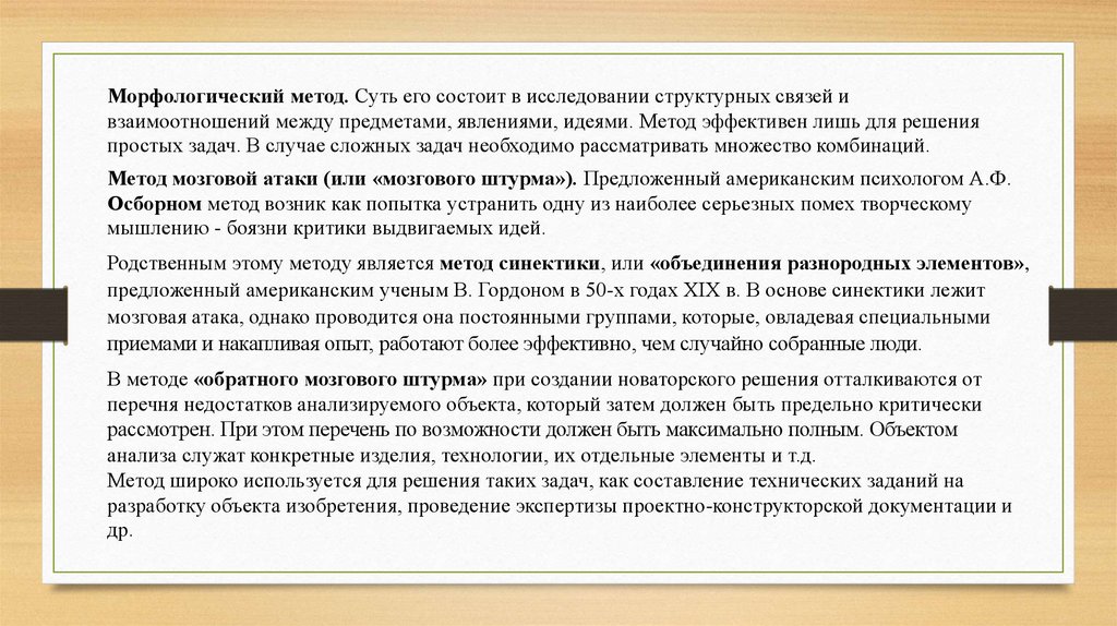 Морфологический метод. Суть его состоит в исследовании структурных связей ивзаимоотношений между предметами, явлениями, идеями. Метод эффективен лишь для решения